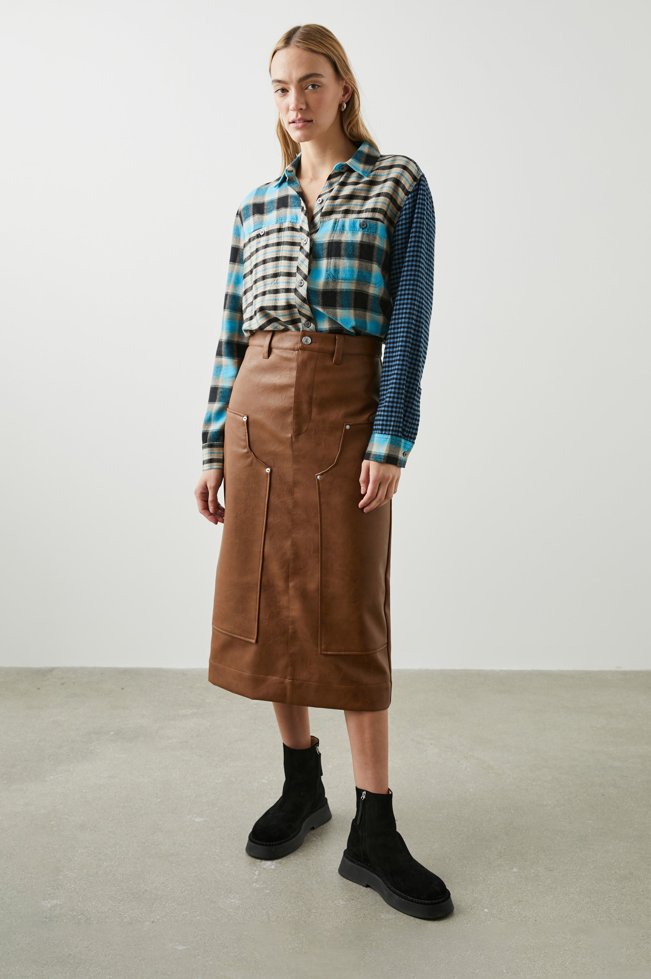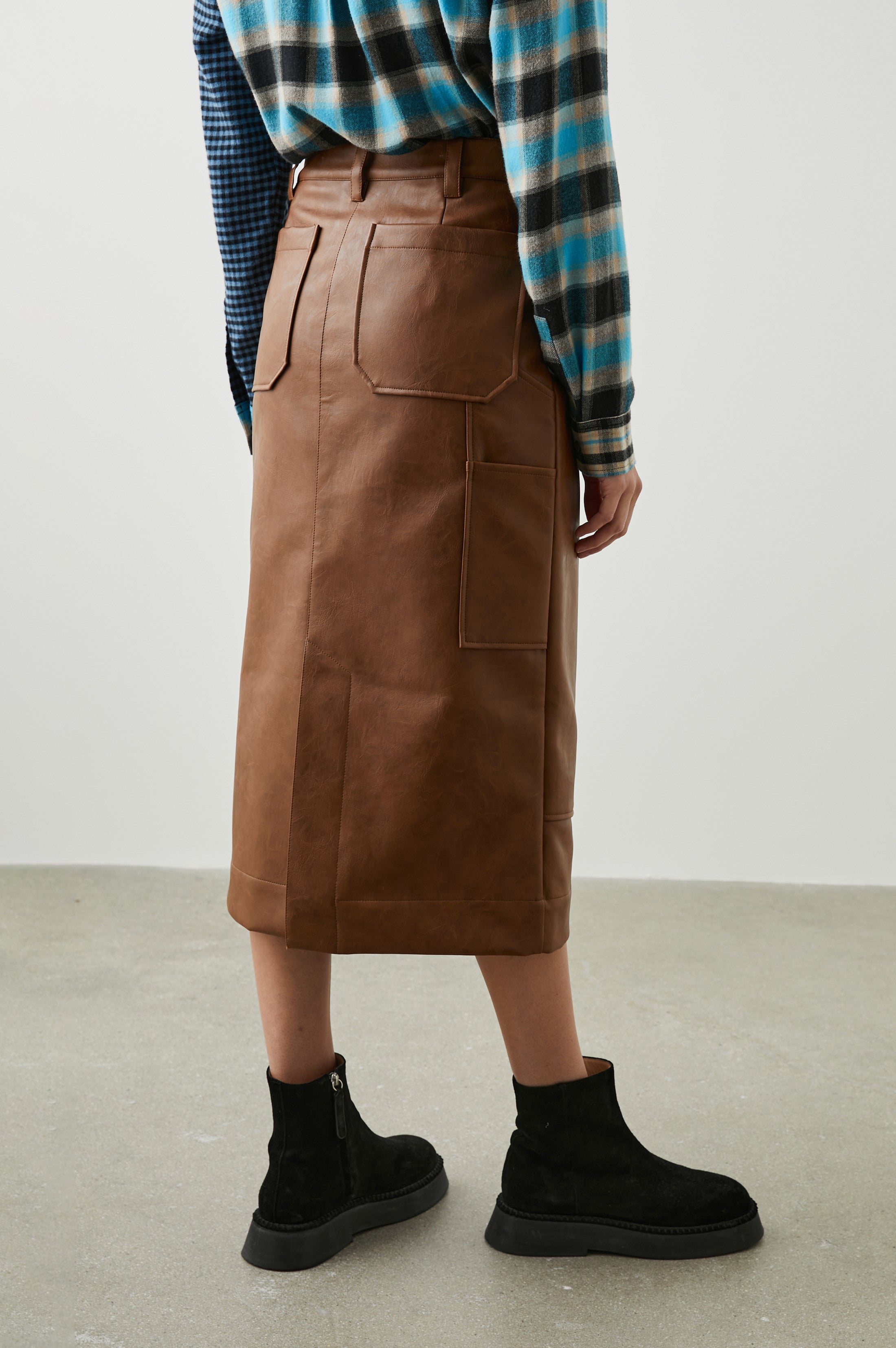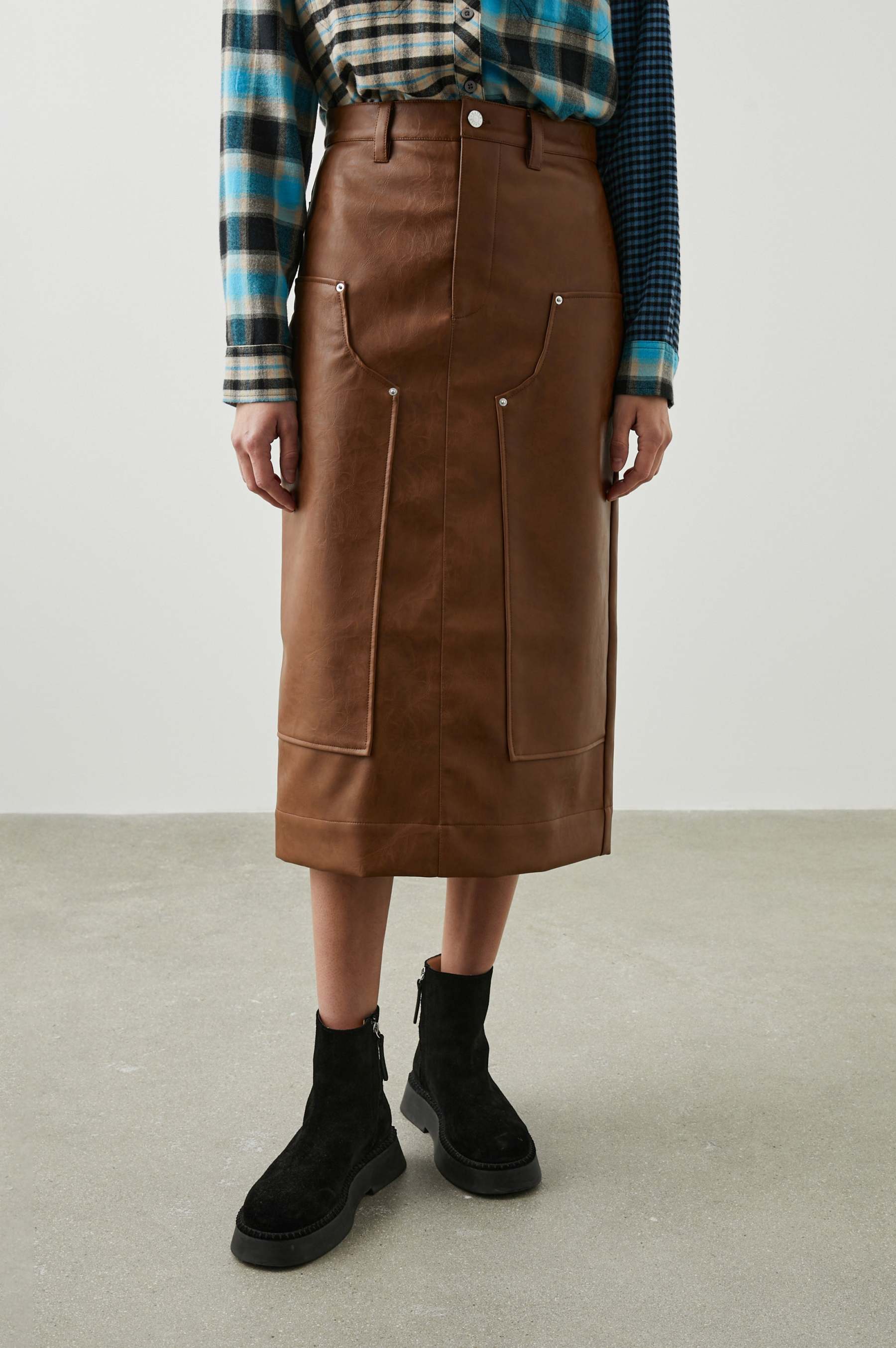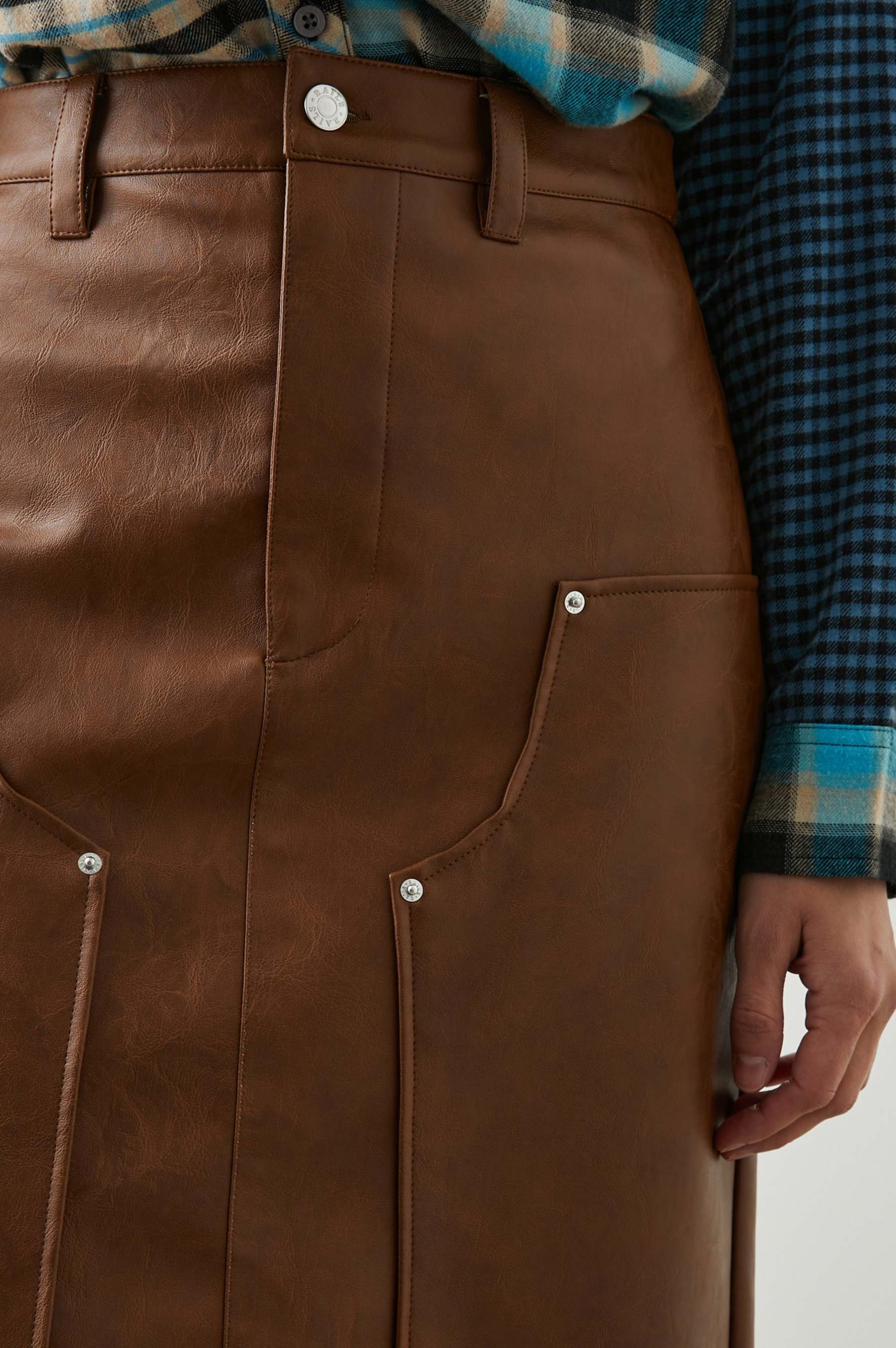This workwear-inspired skirt is the ultimate addition to your winter wardrobe. Made from pre-tarnished faux leather and complete with eye-catching pocket details, this style pairs well with a sweater and boots or the matching Mathis Jacket.